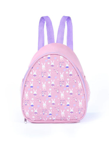 A PVC backpack with repeat bunny pattern, with 2 mesh side pockets.