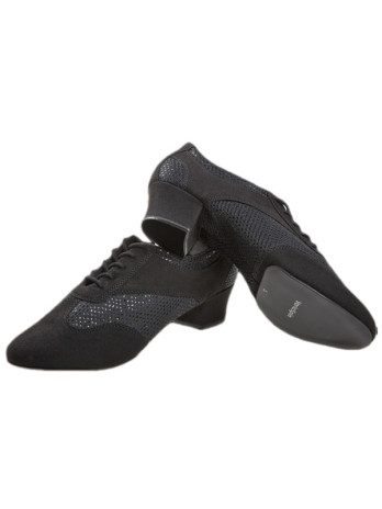 Mod. 188 Diamant ladies practice dance shoes made in Germany handcrafted in high grade competition training style with 5-hole lacing and padded upper edge. This very flexible VarioPro ladies dance shoe with Diamant Multiflex footbed is manufactured in width F (regular width) equipped with a split sole and a shock-absorbing 3,7 cm latin heel. As interior lining a breathable and moisture-absorbent microfiber from an Italian premium producer is used. For the upper materials made out of black microfiber combined with black glitter braided with twinkling sequins high-class materials from Italy and England are used.