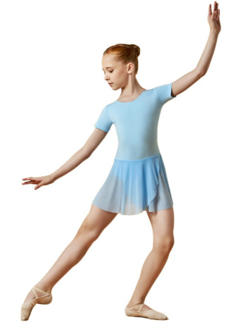 Dekliški dres s kratkimi rokavi z ovratnikom in mehkim mrežastim krilom. Idealno za tiste, ki iščejo enodelno baletno obleko.